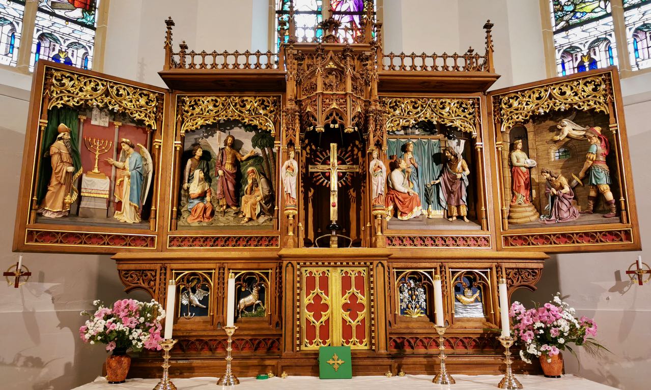 Uns erwartete eine Kirchenführung in St. Johannes Jützenbach in einer plattdeutschen Darbietung. Die Begeisterung war groß über die hölzernen Kunstschätze des Altars und der Besonderheit des Kronleuchters. An diesem sind in Tränenform auf Metallblättchen die Verstorbenen des 1. Weltkrieg namentlich eingraviert.